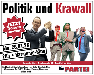Ein Abend mit Martin Sonneborn, unseren Spitzenkandidat_innen, Filmen, Stickern, Plakaten und vielem mehr.